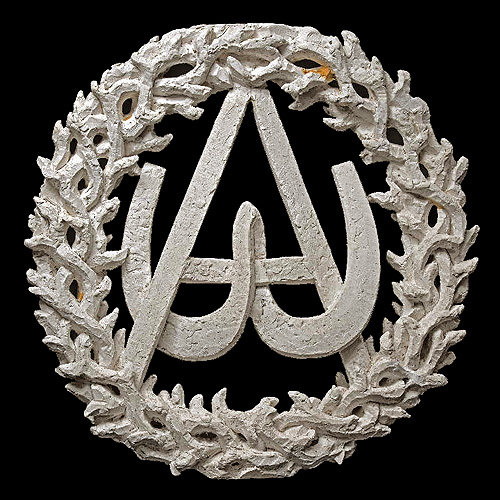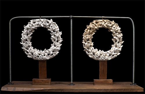 Questi gessi, che rappresentano i modelli degli elementi decorativi del cancello, rimarcano con la loro simbologia la sacralità del luogo. Essi rappresentano una corona di foglie sorretta da due angeli, che racchiude al centro l’agnello di Dio, e sotto la quale si stagliano due corone di rose.