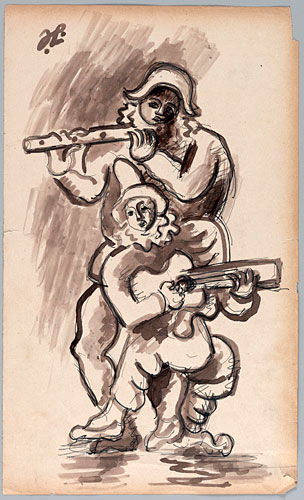 L’anatomia semplificata del protagonista della Commedia dell’Arte, di cui riconosciamo il tipico costume nel tratteggio reticolare accennato asimmetricamente su una spalla e su un’anca, si fonde con la sagoma del mandolino che si staglia in posizione centrale rimandando a un altro tema particolarmente caro all’artista: quello della musica, da lui trattato in numerose opere tra cui il ciclo di bassorilievi eseguiti tra il 1922 e il 1925 per il medico e collezionista americano Albert C. Barnes (tra essi Harlequin with Mandolin in Oval, 1923).