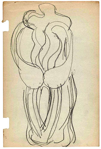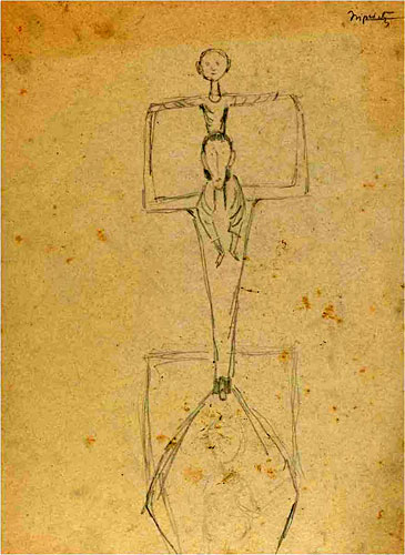 Il movente misterioso di quest’opera, la cui lunga gestione è attestata da uno dei disegni in esposizione risalente alla fine degli anni Trenta, è ricondotto dall’artista alla tragica esperienza della Seconda Guerra Mondiale e al riaffiorare del ricordo di una scena vissuta a Mosca anni prima: “In 1935 I was in Russia and one night, when it was dark and raining, I heard the sound of a pathetic song. I tried to trace it and came to a railroad station where there was a beggar woman, a cripple without legs, on a cart, who was singing, her hair all loose and her arms outstretched. I was terribly touched by this image, but I only realized years later, when I made the Mother and Child, that it was this image that had emerged from my subconsious”.